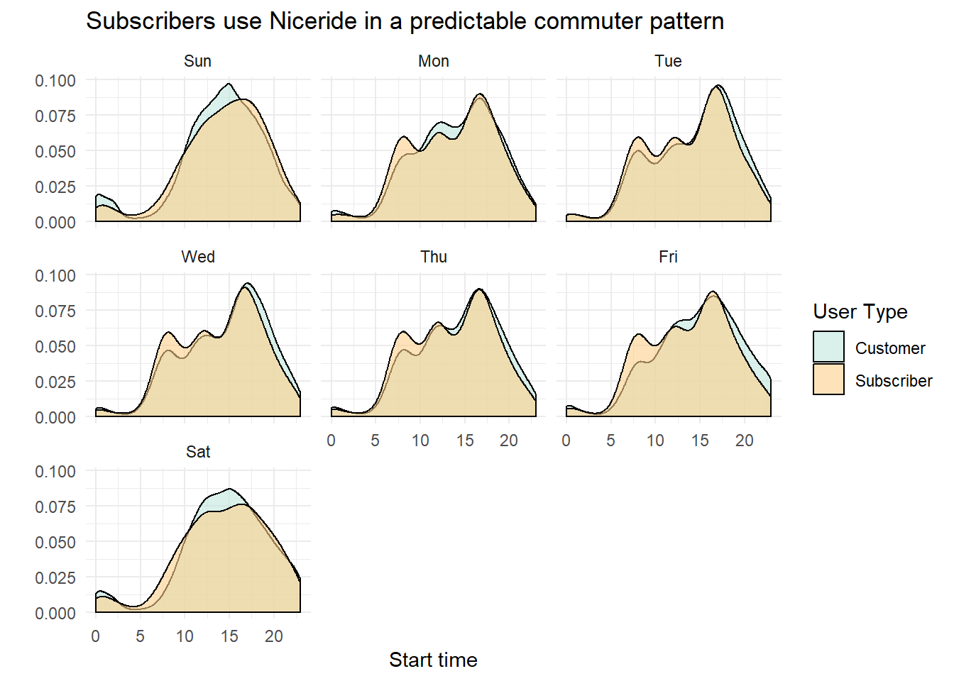 - Create an overlapping density plot of hourly use by user type facetted by weekday (similar to above).